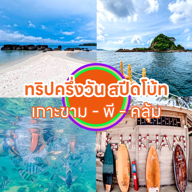 | ทัวร์ดำน้ำดูปะการัง 3 เกาะ สปีดโบ้ท (ครึ่งวัน) | | เกาะขาม - เกาะพี - เกาะคลุ้ม | | รอบเช้า 09.00 น. - 12.30 น. / รอบบ่าย 13.00 น. - 17.00 น. | | จุดหมายปลายทางที่ภูมิใจนำเสนอ "เกาะขาม" ชายหาดสวย | | และแนวหินลาวา ที่แปลกตา แต่ดูรวมกันแล้วสวยลงตัวสุดๆ | | ** ฟรี! บริการถ่ายรูป อยากได้รูปใต้น้ำ โปรแกรมนี้เลย! ** | จองขั้นต่ำ 2 ท่าน *** เรือสปีดโบ้ท / จอยทริป *** | | ราคา 1,200 บาท / ท่าน |